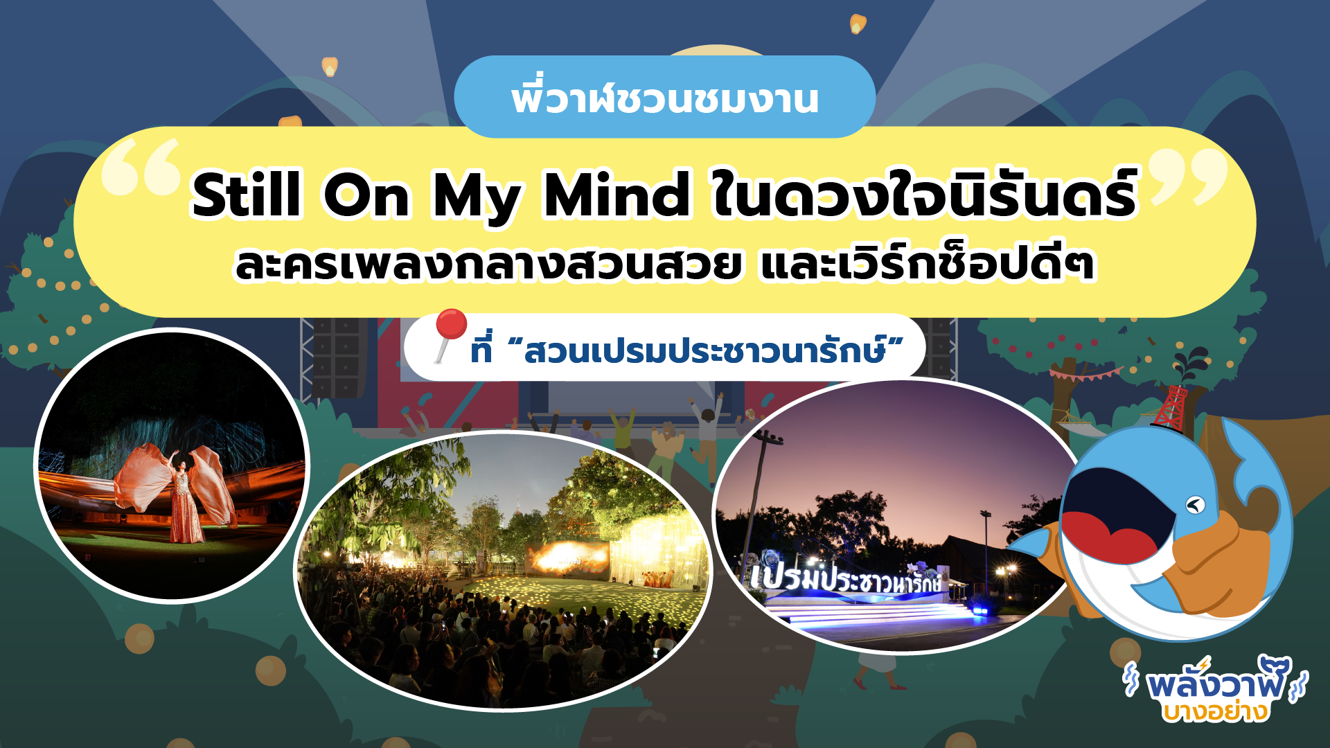 ลมหนาวพัดมาเบาๆ แบบนี้ พี่วาฬเชื่อว่าหลายคนคงกำลังมองหาที่เที่ยวบรรยากาศดีๆ ไว้ออกไปสูดอากาศและพักผ่อนใจกันอยู่ใช่ไหมครับ ช่วงท้ายปีแบบนี้พี่วาฬมีงานอีเวนต์ดีๆ ที่ไม่อยากให้พลาดมาแนะนำครับ งานนี้ชื่อว่า “Still On My Mind ในดวงใจนิรันดร์” งานที่จะพาเราไปสัมผัสบรรยากาศอันอบอุ่นของความรัก ความผูกพัน และร่วมน้อมรำลึกในพระมหากรุณาธิคุณของสมเด็จพระนางเจ้าสิริกิติ์ พระบรมราชินีนาถ พระบรมราชชนนีพันปีหลวง ท่ามกลางสวนสวยยามค่ำคืนที่ประดับไฟงดงามตระการตาครับ งานนี้มีกิจกรรมน่าสนใจเพียบ