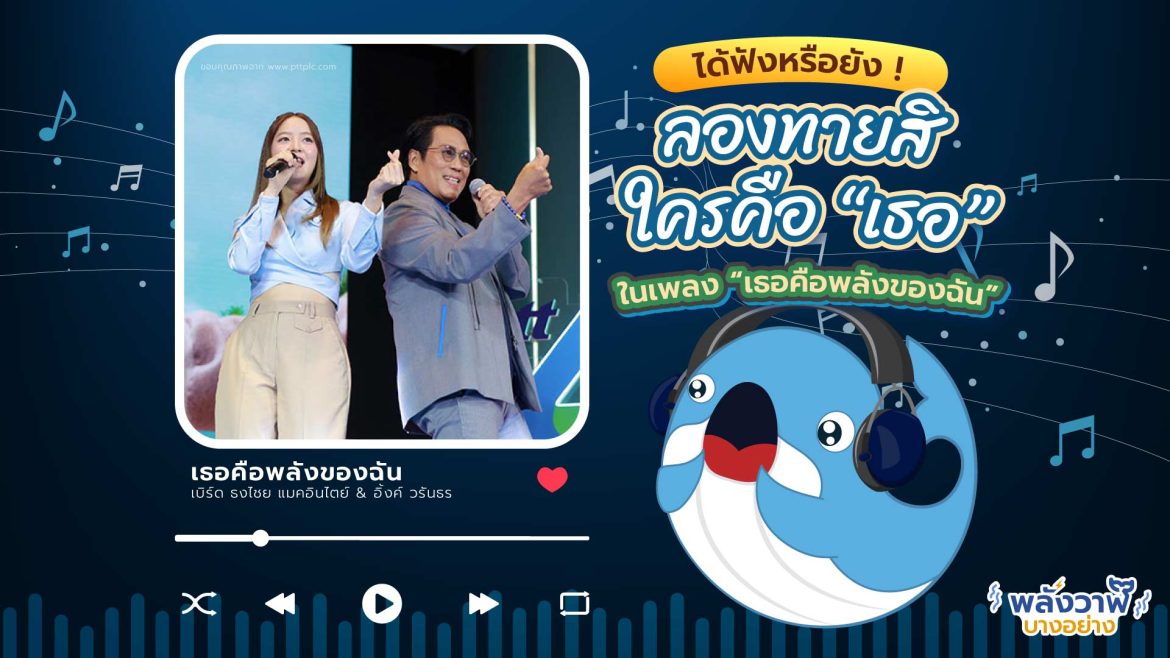 เพื่อแทนคำขอบคุณคนไทยทุกคนในฐานะที่เป็นเสมือนพลังงานบางอย่างที่อยู่เบื้องหลังการส่งเสริมและสนับสนุนการดำเนินงานของกลุ่ม ปตท. มาอย่างต่อเนื่องถึง 45 ปี ปตท.จึงใช้บทเพลงเป็นสื่อแทนใจมอบให้คนไทยทุกคน พี่วาฬขอชวนเพื่อน ๆ ฟังเพลง “เธอคือพลังของฉัน” ฟังได้ทางแอปฯ สตรีมมิ่งเพลง Plearn หรือแอปฯ Joox ฟังแล้วเพื่อน ๆ …
