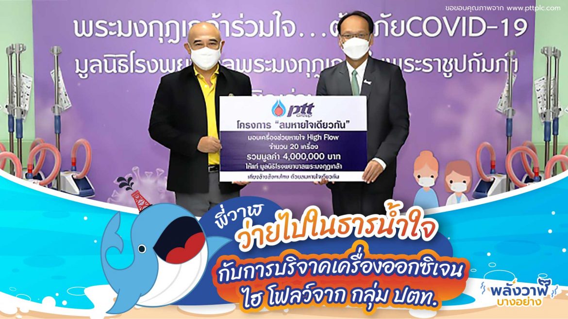 วันนี้พี่วาฬก็ว่ายน้ำอีกเหมือนเดิม แต่ไม่ได้ว่ายในน้ำธรรมดาแต่เป็นในน้ำใจนะ เพราะว่าพี่วาฬอยากชวนทุกคนมาดูการส่งต่อความช่วยเหลือจาก กลุ่ม ปตท. สู่โรงพยาบาลพระมงกุฎเกล้าด้วยการบริจาค เครื่องออกซิเจน ไฮ โฟลว์ (Oxygen High Flow) จำนวน 20 เครื่อง มูลค่า 4,000,000 บาท ภายใต้โครงการลมหายใจเดียวกัน เพื่อใช้ประกอบการ…